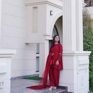 Maroon 3-Piece Pure Raw Silk Short Shirt With Farshi Shalwar